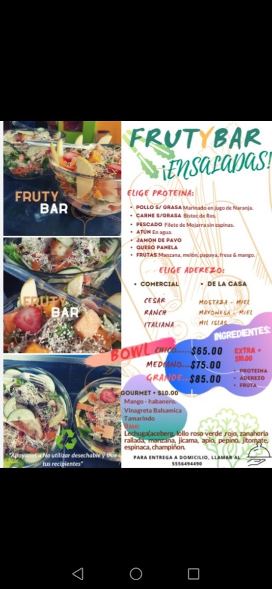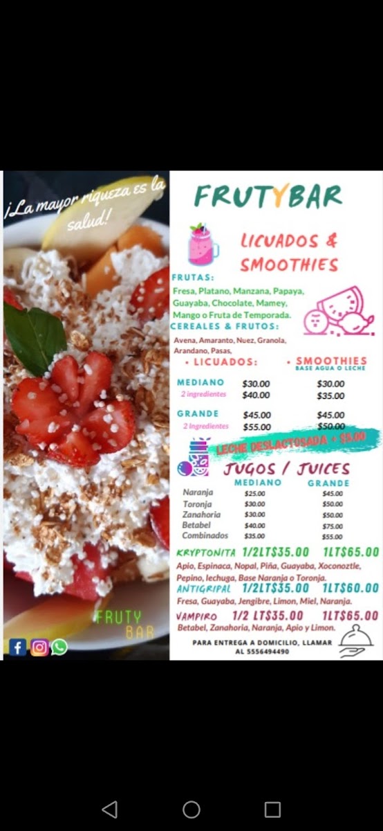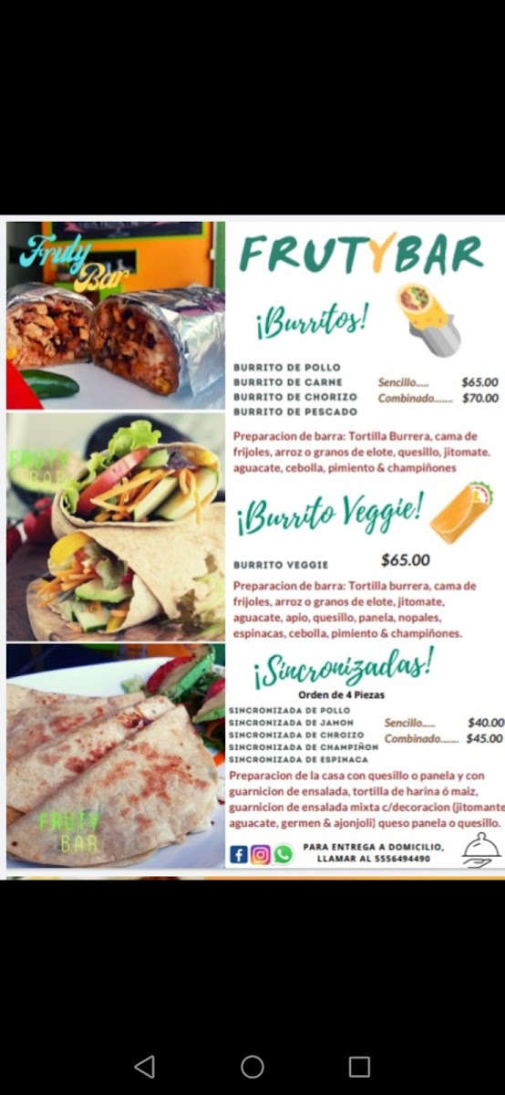 Welcome to FRUTYBAR, your go-to spot for fresh and healthy dining in Ciudad de México. Located at Av. Pdte. Plutarco Elías Calles, this vibrant eatery stands out for its commitment to using natural ingredients and serving made-to-order dishes. Customers rave about the variety and quality of the menu, which features delightful options like refreshing strawberry water infused with blueberries and mint, satisfying tuna sandwiches, and flavorful synchronized chicken with cheese and spinach.